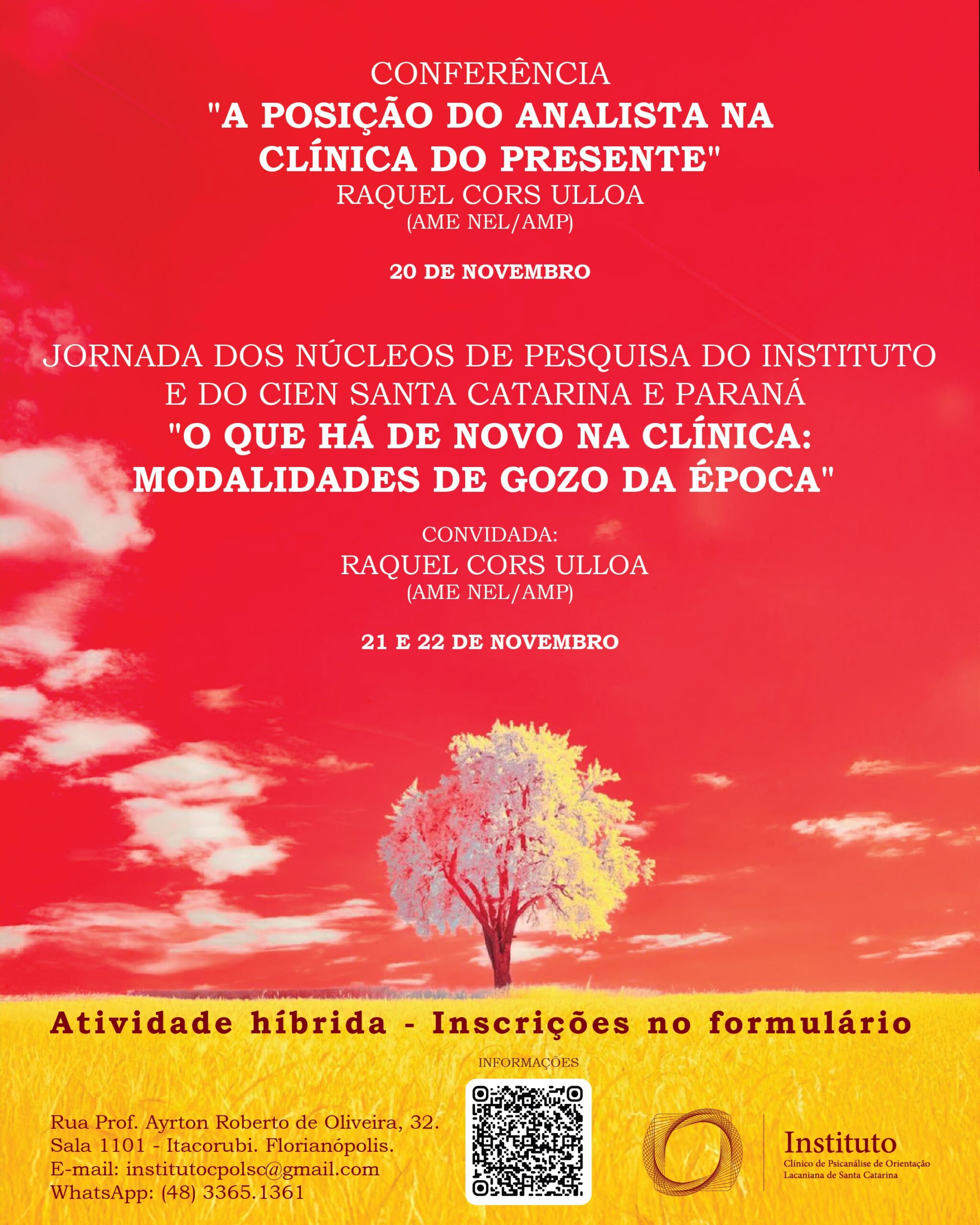 Convidamos a todos para a Jornada de Núcleos de Pesquisa do ICPOL e do CIEN Santa Catarina e Paraná que terá como tema “O que há de novo na clínica: modalidades de gozo da época” nos dias 21 e 22 de novembro com a presença em Florianópolis de Raquel Cors Ulloa (AME NEL/AMP).